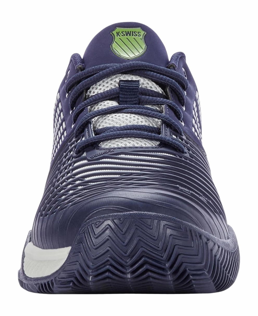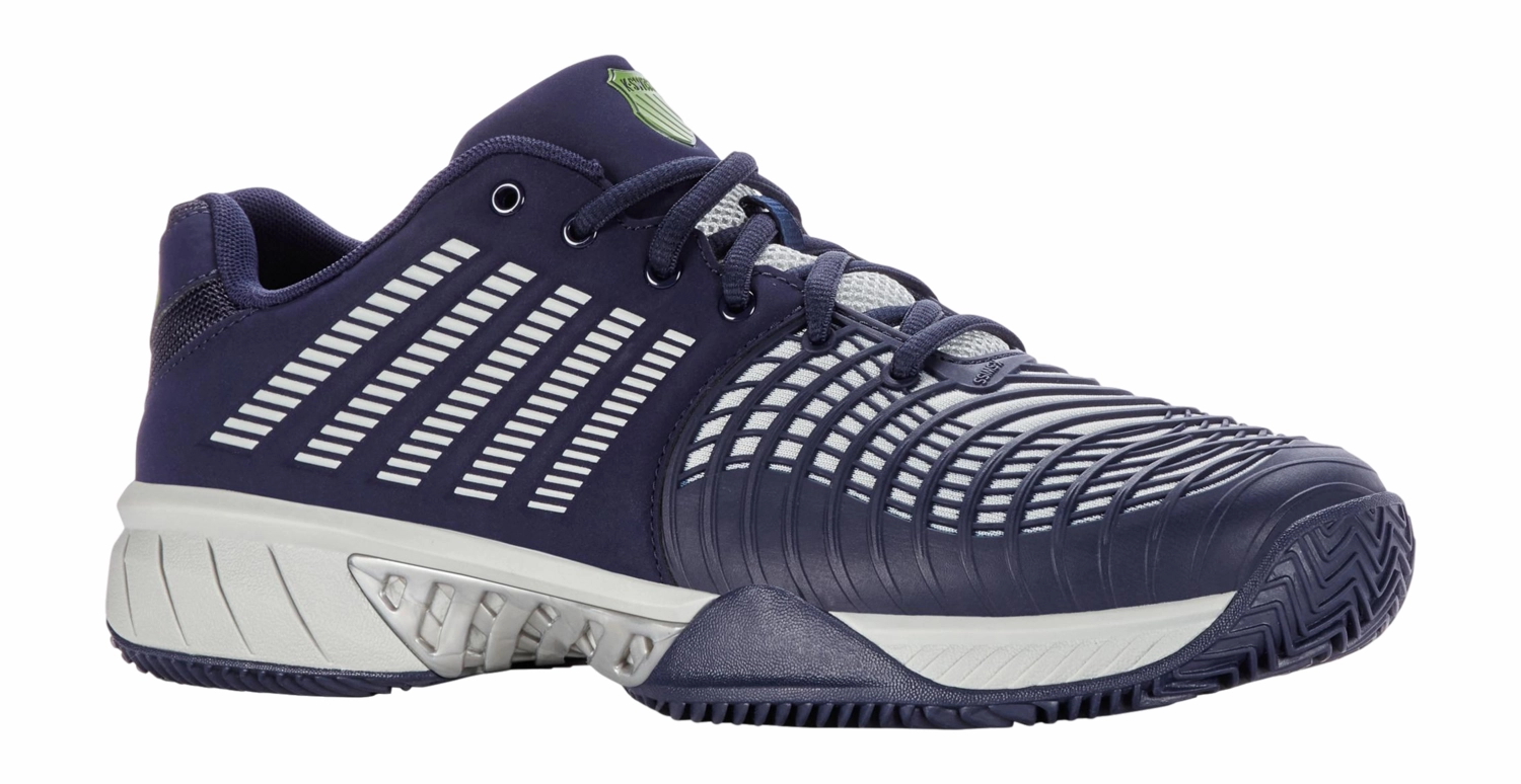 La chaussure de tennis K-Swiss Men Express Light 3 HB en couleur Peacoat, Gray Violet et Lime Green est un excellent choix pour les hommes à la recherche de performances et de confort sur le court de tennis. Avec son design léger et sa fermeture à lacets, cette chaussure de tennis offre un ajustement parfait et une stabilité pendant le jeu. La tige en cuir synthétique et la doublure en textile assurent une respirabilité optimale, tandis que le rembourrage autour de la cheville offre un confort supplémentaire. La semelle est en caoutchouc à motif chevrons, offrant une excellente adhérence sur terre battue. Le châssis plantaire 180 PSC offre une stabilité au niveau de la voûte plantaire. La technologie K-EVA dans la semelle intermédiaire assure un amorti maximal, tandis que la technique Stay-tied permet aux lacets de rester bien attachés. La technologie Durawrap Flex offre une protection contre l’usure et une flexibilité, et le composé en caoutchouc Aösta 7.0 assure une durabilité de la pointe au talon. La semelle intérieure Ortholite offre un amorti et une réactivité au pied. En résumé, la chaussure de tennis K-Swiss Men Express Light 3 HB est le choix parfait pour les joueurs de tennis sérieux à la recherche de confort, de stabilité et de performances sur le court.
