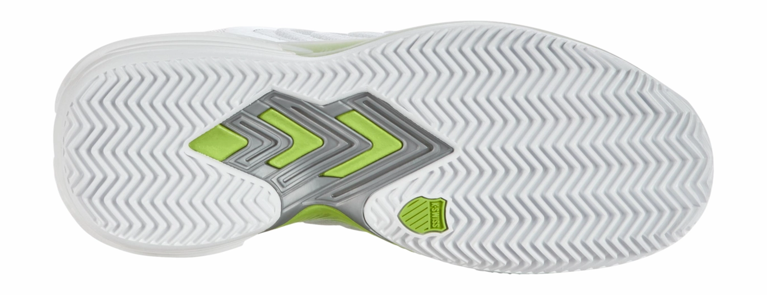 La marque K-Swiss est leader sur le marché des baskets. L’entreprise, créée en 1966, ne cesse de se développer et se présente comme une marque innovante, performante et de qualité. Les chaussures K-Swiss associent à la fois un design très tendance et un confort immédiat. On les repère très rapidement grâce aux 5 bandes sur le côté de la chaussure. N’attendez plus pour choisir votre basket de tennis! Chez TennisPlannet, vous trouverez votre chaussure idéale, que vous soyez un homme ou une femme! La chaussure de tennis K-Swiss Ultrashot 3 HB est un incontournable pour les joueuses de tennis compétitives, agressives et puissantes. Avec une palette de couleurs allant du blanc, au violet gris, en passant par le vert citron, cette chaussure est non seulement élégante mais aussi fonctionnelle. La tige 100% synthétique et la semelle en caoutchouc offrent durabilité et confort pendant le jeu. Grâce à sa grande respirabilité, vos pieds resteront frais et secs, même pendant les matchs les plus intenses. Portée par des athlètes professionnels de l’ATP et de la WTA, cette chaussure offre la combinaison parfaite de stabilité, de résilience et de traction. Avec des fonctionnalités telles que le disque de rotation dans la semelle, la technique Stay-tied et la technique Durawrap, vous êtes assuré de mouvements rapides, de lacets solides et d’une protection contre l’usure. De plus, la technologie Aösta 7.0 en caoutchouc, le composé de mousse Surge 7.0, le Dragguard 7.0, le Slideguard et le châssis 360 PSC Plantar offrent une performance optimale. La chaussure est également dotée de DuraMesh avec des fils TPU insérés pour une respirabilité accrue et un soutien supplémentaire. Les orteils et le talon de la chaussure sont protégés grâce à la technologie Dragguard 7.0. Les motifs en forme de chevrons sur la semelle offrent une excellente traction sur terre battue. Convient aux femmes sérieuses dans leur jeu de tennis, ces chaussures de tennis sont le choix idéal pour améliorer vos performances.